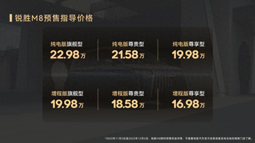 11月5日,作为北京汽车制造厂旗下专注MPV赛道的独立品牌,锐胜汽车正式宣布首款大型MPV产品——锐胜M8开启预售。新车提供增程版与EV版两种动力选择,预售价格分别为16.98万元起与19.98万元起。锐胜M8以“越级空间、越级补能、越级续航、越级舒享”四大核心优势,为用户提供“宜商、宜家、宜旅”的全场景出行解决方案,旨在实现“15万级价格,30万级享受”的市场突破。
